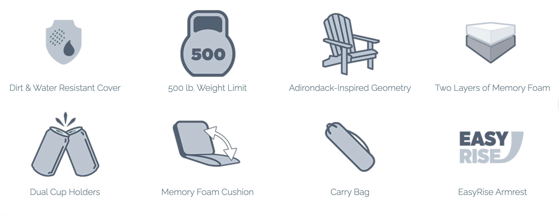 The entire system packs into an included carry bag. From the garage to the trailhead, backyard to bleachers — this chair is ready to move when you are. Dirt- and water-resistant throughout.