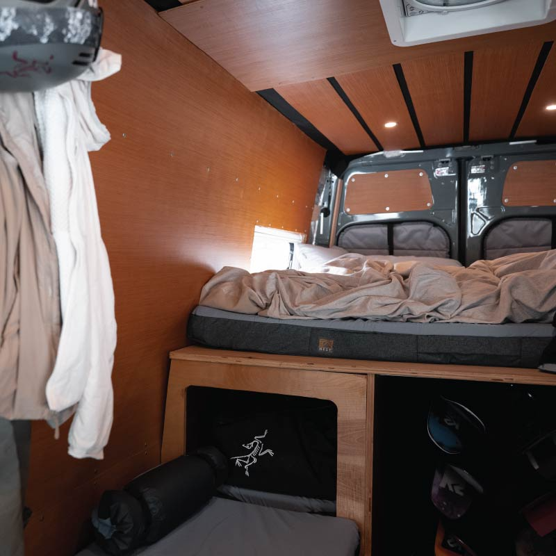 Sleeping: a full HEST Dually Custom S75 setup, the 170 wheel base van gives length for bed for someone over 6’ tall