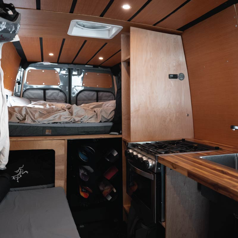 Van interior details: bed, bench, kitchen, and storage.