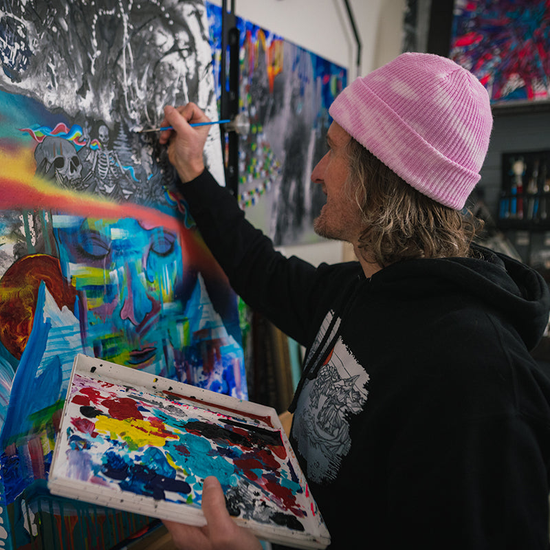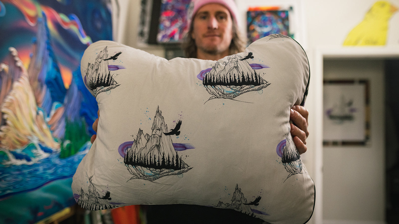 Whether it’s carving fresh pow or inking up a blank canvas, Chris’ artistry is a constant source of inspiration to all of us at HEST. When we asked him to collaborate on a Pillowdesign, we knew whatever he came up with would be dreamy. His art tickles the subconscious with mystical creatures and colorful dreamscapes.